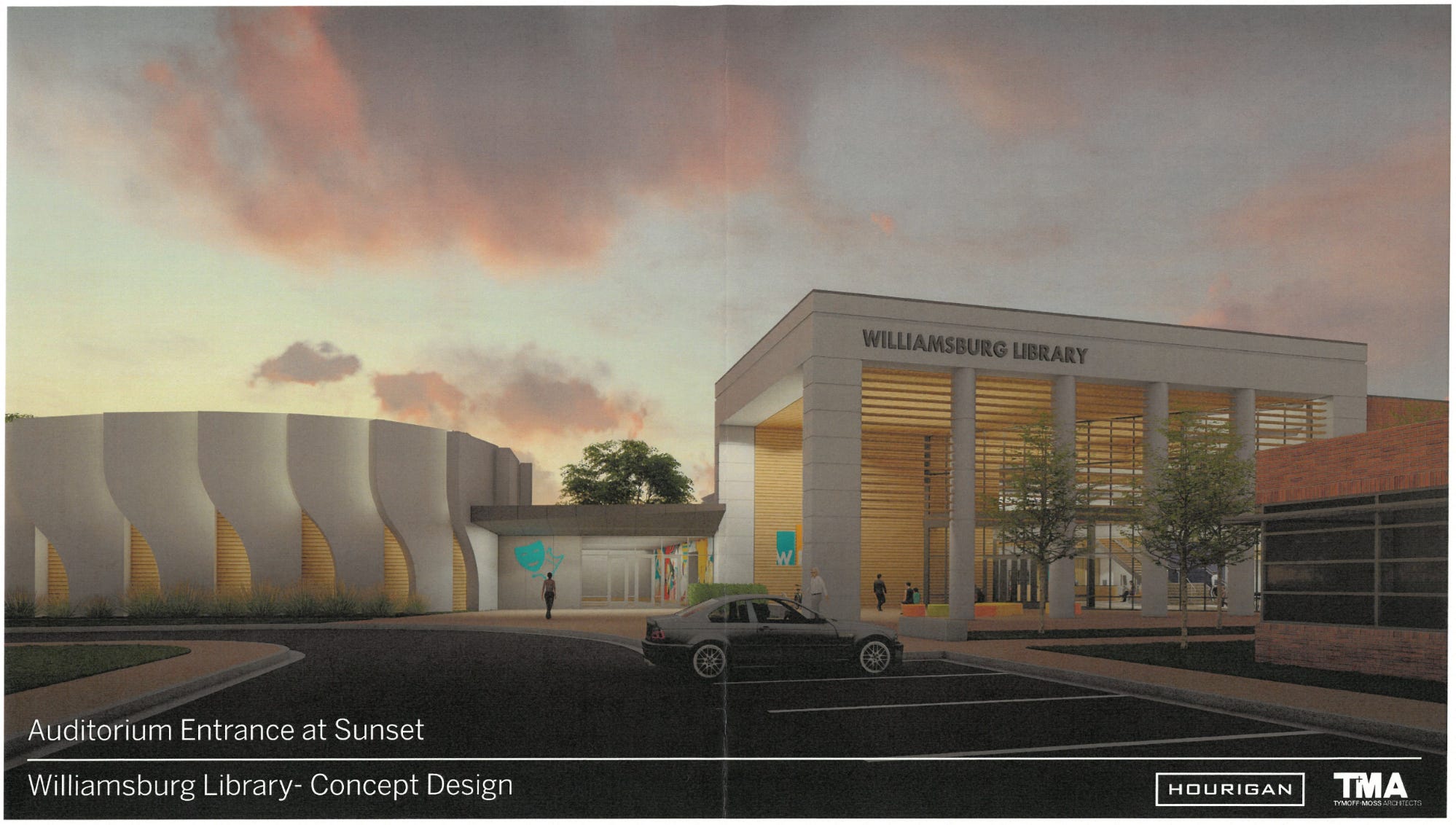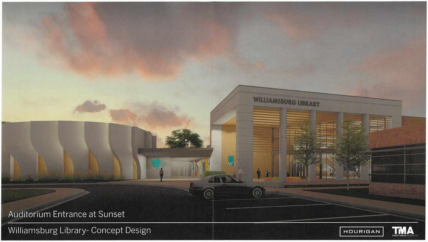 A conceptual drawing of the proposed new library in downtown Williamsburg. The library’s design will be reviewed by the city’s Architectural Review Board (ARB) on Jan. 27. Design of the new facility continues though the regional library system’s operating agreement remains unresolved, with James City and York Counties pursuing separate library projects. (Official image from City of Williamsburg, Hourigan, TMA)