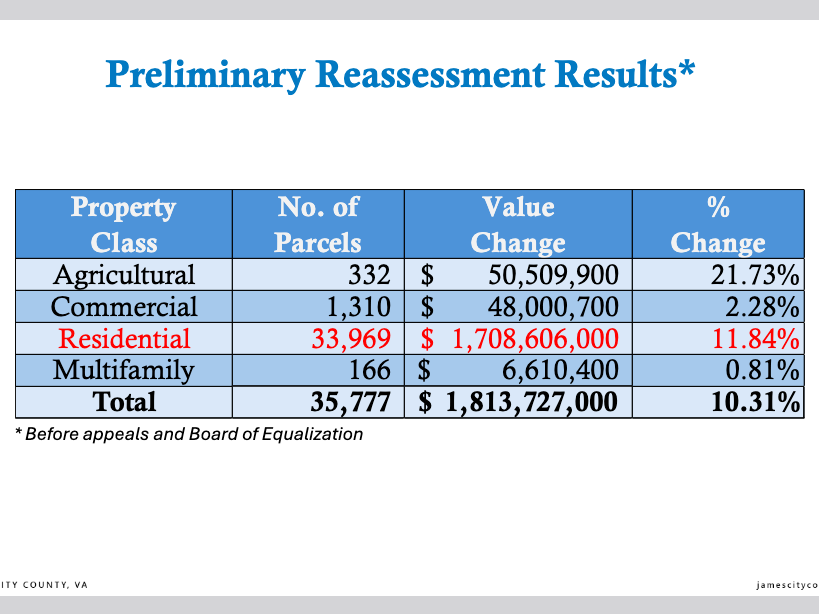Preliminary 2026 reassessment data shows James City County property values increased 10.31% overall, with residential properties rising 11.84% and commercial properties increasing 2.28%. The Board of Supervisors also discussed $8.7 million in increased outside agency funding requests and a five-year capital improvement program totaling $316.6 million, including a $124 million Consolidated Government Center. (Graphic: James City County)