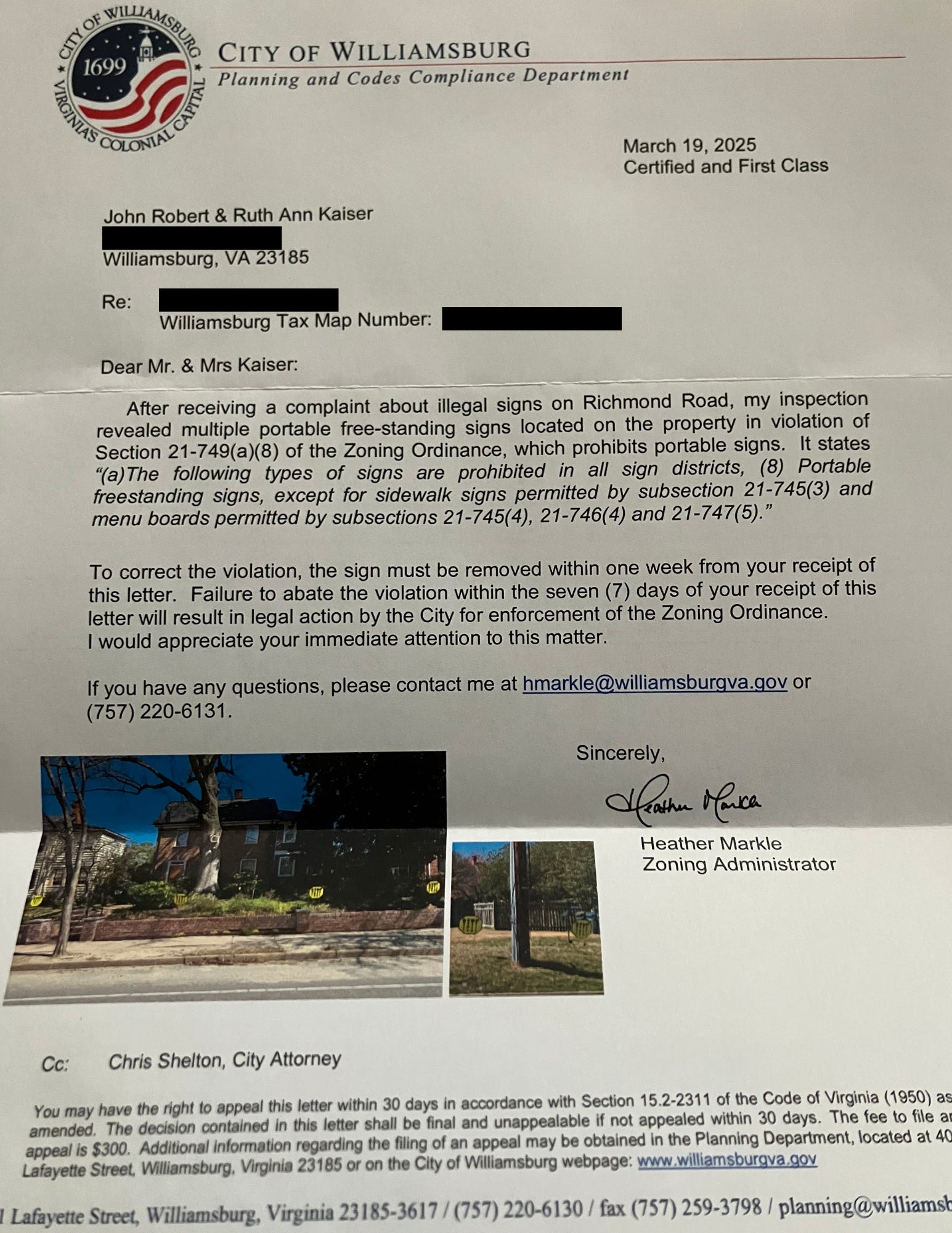 A complaint about a protest yard sign prompted the City of Williamsburg to send a letter to residents last week demanding that the signs be removed from their yard. A code violation letter, dated March 19, was sent to Ruth Kaiser, the organizer of the STOP petition, about signs in her yard. It is unknown how many other residents also received the letters. In the correspondence to Kaiser, the City’s Zoning Administrator, Heather Markle, notes that the enforcement is in response to “a complaint about illegal signs on Richmond Road.” Markle warns that the signs must be removed within 7 days of receipt of the letter, or the homeowner faces “legal action by the City.” The communication also states that the homeowner would need to pay $300 to file an appeal. The letter does not identify the source or nature of the complaint.