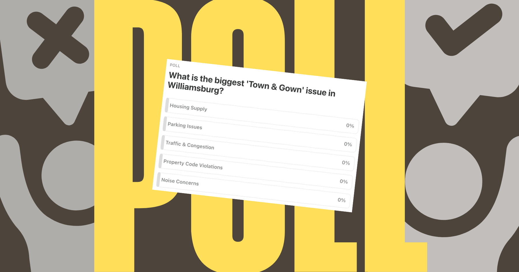 So, since neither the City or the College asked your opinion while compiling the report, the Williamsburg Independent will. The question is: “What is the biggest ‘Town & Gown’ issue in the City?” Is it a shortage of housing, parking issues, traffic and congestion, property code violations, noise concerns? Cast your vote in our online poll above.